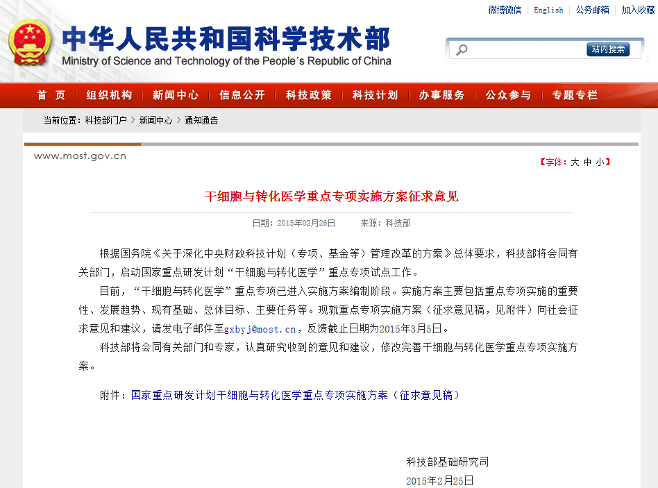 2015-08-28 查看更多干細(xì)胞與轉(zhuǎn)化醫(yī)學(xué)重點(diǎn)專項(xiàng)實(shí)施方案征求意見 根據(jù)國務(wù)院《關(guān)于深化中央財(cái)政科技計(jì)劃(專項(xiàng)、基金等)管理改革的方案》總體要求,科技部將會(huì)同有關(guān)部門,啟動(dòng)國家重點(diǎn)研發(fā)計(jì)劃“干細(xì)胞與轉(zhuǎn)化醫(yī)學(xué)”重點(diǎn)專項(xiàng)試點(diǎn)工作。 目前,“干細(xì)胞與轉(zhuǎn)化醫(yī)學(xué)”重點(diǎn)專項(xiàng)已進(jìn)入…